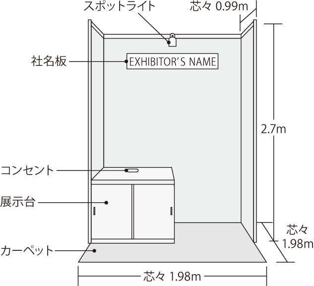 出展料に含まれるもの: 間口2.0m×奥行2.0mの展示スペース、間仕切り(後壁、測壁1m)/社名板/展示台(W990×D990×H1020)×1/床面カーペット/電気(LEDスポットライト15W×1)/電気幹線工事費及び使用料(500W以内)/コンセント(アース付100V・2個口)×1