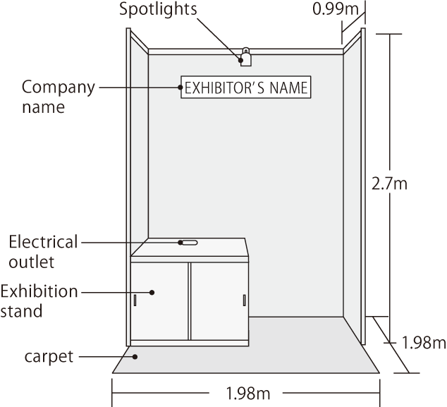 Included in the exhibition fee: Exhibition space / Rear and 1m side walls / Company nameplate / Carpet / Exhibition stand (W990 × D990 × H750) / Slide door unit (without key) / LED spotlight 15W × 1 / Electrical outlet × 2 (100V with ground) / Wiring cost and Electric rates × 500W